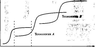 Первоначальные вложения в разработку новой технологии обеспечивают весьма незначительные результаты. Затем, когда происходит накопление и использование ключевых знаний, результаты улучшаются быстро. И, наконец, наступает момент, когда технические возможности технологии (технико-экономические показатели (ТЭП) технологии или ТЭП выпускаемой на ее основе продукции) исчерпаны и прогресс в этой области становится все более трудным и дорогостоящим, а дополнительные вложения средств лишь незначительно улучшают результаты (верхний участок логистической кривой). Пределы технологии обусловлены естественными законами, на которых она основана, и проявляются в невозможности улучшить технический уровень технологии (изделия и его качества) и получить экономическую отдачу, т. е. создание различных модификаций не обеспечивает прироста эффекта, воспринимаемого потребителями. Достигнутый предел в развитии какой-либо технологии не означает завершения ее жизненного цикла, что связано, во-первых, с отсутствием в завершенном виде новой эффективной технологии и продолжением выпуска продукта, который пользуется спросом, во-вторых, с возможностью создания на основе этой технологии новых для рынка продуктов. Когда появляется новая технология, она замещает устаревшую и имеет свою S-образную кривую. Промежуток между двумя кривыми представляет собой технологический разрыв, где одна технология замещает другую (рис. 3.7). Результативность технологии (технико-экономические показатели технологии или продукта, производимого на ее основе)