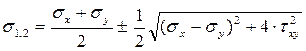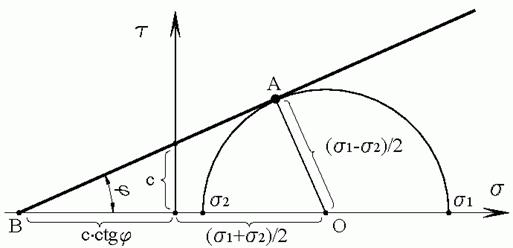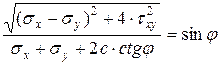 Если в уравнениях (2.3) положить сцепление с равным нулю, то величина tg2 (45° - j / 2) будет представлять собой коэффициент бокового давления сыпучей среды в предельном состоянии. Этот коэффициент называют также коэффициентом активного давления. В отличие от этого коэффициент tg2 (45° + j / 2) называют коэффициентом пассивного давления. Он позволяет вычислить действующее напряжение при известном боковом давлении в сыпучей среде. При j = 0 говорят, что среда является идеально связной. Полученное в лекции № 1 выражение для коэффициента бокового давления через коэффициент Пуассона справедливо в предельном состоянии только для идеально связной среды, например, для пластичной глины. Для сыпучей среды коэффициент бокового давления в предельном состоянии остается меньшим единицы. Уравнение прочности в компонентах тензора напряжений. Основным неудобством в применении уравнений (2.3) является необходимость вычисления в грунтовом массиве главных напряжений. Этого можно избежать подстановкой в уравнение (2.2) значений главных напряжений, выраженных через компоненты тензора напряжений: