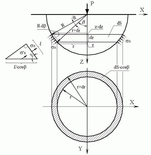 плоскостью на глубине z – dz образуется окружность радиусом r + dr с углом видимости на вертикальном разрезе b + db. Рассмотрим равновесие сферического кольца, выделенного из полусферы двумя горизонтальными плоскостями на глубине z и z – dz. С учетом того, что длина образующей сферического кольца равна Rdb, площадь его поверхности определится формулой: S = 2×p×r × R×db. На поверхности сферического кольца действуют нормальные напряжения sR, а касательные напряжения в соответствии с гипотезой а) отсутствуют. Найдем напряжения sR из условия равновесия проекций всех сил, действующих по поверхности полусферы радиусом R, на вертикальную ось z. Условие равновесия: