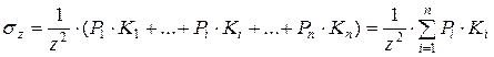 Коэффициент К, зависящий от безразмерного параметра r/z, приводится в справочных данных. Формулы (3.5) и (3.6) при z = 0, т.е. в точке приложения силы Р, дают бесконечные значения напряжений. Теоретически это объясняется тем, что сила Р действует на бесконечно малой площадке, в связи с чем напряжения на этой площадке стремятся к бесконечности. С практической точки зрения этот результат является некорректным и подлежит разрешению. 2. Напряжения в грунтовом массиве от действия группы сил. При нагружении линейно-деформируемой среды по аналогии с упругой средой применим принцип суперпозиций. Используя этот принцип, напряжение в грунтовом массиве от действия группы сил можно представить как сумму напряжений от действия отдельных сил. При этом слагаемые в указанной сумме могут определяться по формулам Буссинеска. Например, для загружения грунтового массива по схеме, представленной на рис. 3.2, нормальное напряжение на горизонтальной площадке на глубине z может быть определено по формуле: