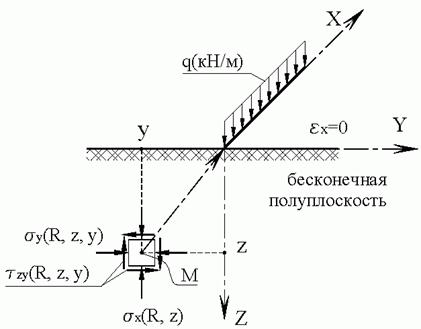 Тогда в сечениях полупространства плоскостями, нормальными к оси x, будем иметь полуплоскости, напряженно-деформированное состояние которых подобно, а деформация по направлению оси x равна нулю. Как уже отмечалось, такое напряженное состояние называется плоской деформацией. Напряжения в точке М полуплоскости с радиусом-вектором R и координатами y, z в соответствии с решением Фламана определяются формулами: