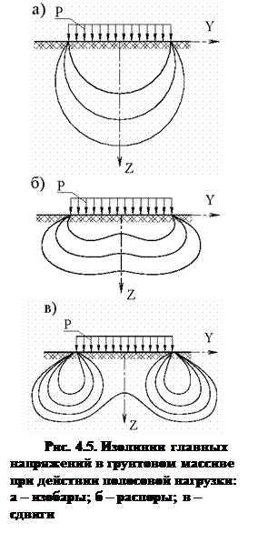 Изобарами называют линии равных вертикальных давлений (рис. 4.5 а). Распорами называют линии равных боковых давлений (рис. 4.5 б). Сдвигами называют линии равных касательных напряжений (рис. 4.5 в). Указанные линии строятся как графики sz = const, sy = const, tzy = const, например, с использованием уравнений (4.2). С удалением от центра загруженной поверхности и с увеличением глубины вертикальные давления уменьшаются. При этом линии равных давлений подобны концентрическим усеченным эллипсам с главной вертикальной осью, проходящей через центр загруженной поверхности. Горизонтальными сечениями изобар можно проследить закономерности изменения давлений по ширине грунтового массива. Общая закономерность сводится к следующему. С увеличением глубины интенсивность давлений уменьшается, а зона их действия по ширине увеличивается. При этом площади эпюр давлений в горизонтальных сечениях остаются постоянными. В несвязных грунтах можно приблизительно полагать, что область распределения давлений в грунтовом массиве ограничена расходящимися лучами, исходящими из крайних точек загруженной поверхности и наклоненными к горизонтали под острыми углами, равными углу внутреннего трения.