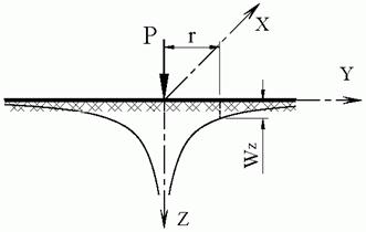 Распределение распоров характеризуется наличием седловидной впадины в центре загруженной поверхности. Максимальных значений распоры достигают на границах области распределения вертикальных давлений. Сдвиги распределяются в форме двух симметричных зон с центрами по краям загруженной поверхности. Геометрически указанные распределения подобны концентрическим эллипсам, главные большие оси которых наклонены и расходятся от центра загруженной поверхности. Максимальные значения сдвигов достигаются (концентрируются) в крайних точках загруженной поверхности. Этот результат уже использовался при описании фаз напряженно-деформированного состояния грунтового основания. 3. Контактные напряжения. До сих пор изучались вопросы распределения напряжений от действия распределенной по площади нагрузки. Нагрузка передавалась непосредственно на поверхность грунтового массива без посредства какой-либо конструкции. Такая схема передачи нагрузки характерна при возведении на основании земляных сооружений, например, насыпей, при передаче нагрузки через гибкую плиту и т.п. Во всех этих случаях говорят, что нагрузка передается на основание через абсолютно гибкий штамп. Таким образом, абсолютно гибким штампом называют конструкцию, сопротивлением изгибу которой можно пренебречь. Нагрузка на основание от сооружений чаще всего передается через жесткие конструкции, называемые фундаментами. Если собственными деформациями такой конструкции можно пренебречь, ее называют абсолютно жестким штампом. Все остальные конструкции, через которые передается нагрузка на основание, называют фундаментами (говорят также, штампами конечной жесткости). Контактными напряжениями называют напряжения на контакте поверхности основания с нижней поверхностью конструкции, через которую передаются нагрузки. Нижняя поверхность такой конструкции называется подошвой фундамента. Вертикальные напряжения, действующие на основание со стороны подошвы фундамента, называют давлениями. Уравновешивающие эти давления напряжения, действующие на подошву фундамента со стороны основания, называют отпором грунта. Решим задачу о распределении давлений на основание под жестким штампом при действии на него вертикальной нагрузки. Воспользуемся формулой, полученной Буссинеском, для определения осадок (вертикальных перемещений) wz поверхности линейно-деформируемого полупространства (рис. 4.6) от действия сосредоточенной силы Р: