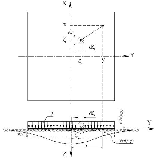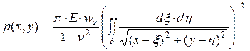 Рис. 4.7. Осадка поверхности упругого полупространства от действия распределенной по площади F нагрузки интенсивностью р (кН/м2) Принимаем в выражении (4.6) wz (x, y) = wz = const и разрешая его относительно р как функции x, y, получим формулу для распределения давлений p (x, y) под абсолютно жестким штампом: