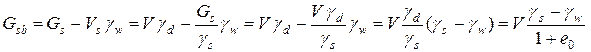 где P, Mx, My – продольная сила и изгибающие моменты относительно центральных осей на уровне подошвы фундамента; 4. Напряжения от собственного веса грунта. Вертикальные напряжения от собственного веса грунта называют бытовыми давлениями, а график их изменения по глубине – эпюрой бытовых давлений. Напряжения от собственного веса грунта определяются на основании следующих упрощающих гипотез: 1) напряженным состоянием грунта при действии его собственного веса является осесимметричное компрессионное сжатие; 2) вертикальные напряжения в грунте определяются суммированием напряжений от веса элементарных слоев грунта; 3) грунт, находящийся ниже уровня грунтовых вод, испытывает взвешивающее действие воды; 4) слой грунта, находящийся ниже водоносного слоя, называется водоупором и испытывает на своей поверхности гидростатическое давление водяного столба. Удельный вес грунта во взвешенном состоянии определяется на основании следующих расчетов. Обозначим: Gsb (кН) – вес грунта объемом V (м3) во взвешенном состоянии; Gs, Vs – вес и объем частиц грунта в объеме V; gd, gs, и gw – удельные веса сухого грунта, частиц грунта и воды. Определим Gsb и gsb – удельный вес грунта во взвешенном состоянии: