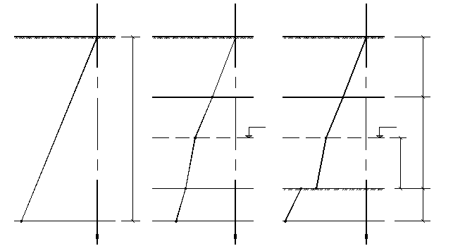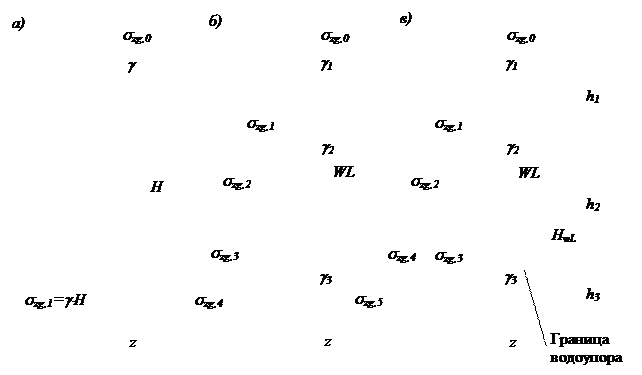 где gi – g или gsb для i –го слоя грунта; hi – толщина i –го слоя грунта; Формула (4.13) используется для вычисления бытовых давлений на границах геологических слоев, на линии уровня грунтовых вод и на границе водоупора. В остальных сечениях бытовые давления могут быть определены по линейной интерполяции. На рис. 4.9 представлены характерные эпюры бытовых давлений в грунтовом массиве. На границах геологических слоев угол наклона эпюры, как правило, изменяется в связи с изменением величины удельного веса грунта. На линии уровня грунтовых вод (WL) имеет место самый заметный перегиб эпюры, вызванный уменьшением удельного веса грунта во взвешенном состоянии. На границе водоупора эпюра имеет скачок на величину гидростатического давления от веса столба воды над водоупором.