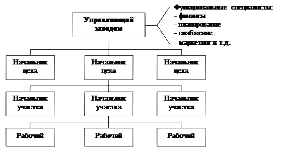 Функциональную структуру управления (рис.4.7) используют при большом количестве специализированных работ в организации. Предусматривает группирование специалистов и подразделений, выполняющих отдельные функции управления. При этом выполнение указаний функциональных органов (отделов планирования, учета, обслуживания производства и т. д.) в пределах их компетенции обязательно для производственных подразделений.