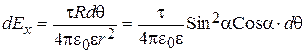 Для получения параметров поля кольца следует взять интеграл по всей длине кольца. Обозначив угол до элемента кольца q, пределы интегрирования получим от q=0 до q=2p. Расстояния от любого элемента кольца до точки на оси будут равны между собой (r). Равны также и углы между r и х (угол a). После интегрирования получаем:
