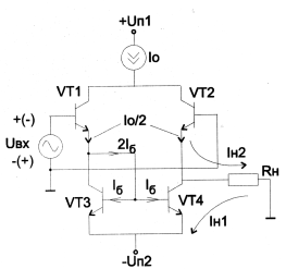 Схема показана на рис. 79. VT1 и VT2 с источником тока I0 повторяют первую схему. Добавлены VT3 и VT4, образующие повторитель тока эмиттера транзистора VT1. Ток 2Iб при больших коэффициентах усиления»0. Схема на транзисторах VT3 и VT4 называется “токовое зеркало”.