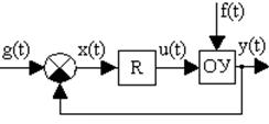 где a0,...,an в линеаризованной системе представляют собой постоянные коэффициенты. Полином Q(p) степени m (m£n) от символа дифференцирования p определяет влияние задающего воздействия g(t) на характер изменения ошибки. Полином N(p) степени k (k£n) от символа дифференцирования p определяет влияние возмущающего воздействия f(t) на характер изменения ошибки. В принципе таких возмущений может быть несколько. Однако вследствие линейности действует принцип суперпозиции и достаточно рассмотреть методику учета только одного воздействия; при наличии нескольких возмущений необходимо лишь просуммировать результат. Из (4.1) вытекает, что ошибка может быть представлена в виде суммы двух составляющих: первая составляющая определяется влиянием задающего воздействия, вторая - возмущающего воздействия. При решении системы дифференциальных уравнений относительно управляемой величины получается уравнение движения объекта управления при наличии регулятора. Это уравнение получается в результате подстановки выражения для ошибки x(t)=g(t)-y(t) в уравнение (4.1): D(p)y(t) = R(p)g(t) - N(p)f(t), (4.3) где R(p) = D(p) - Q(p).