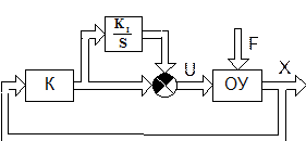 где KI - матрица обратных связей по интегралу от вектора состояния. Комбинированный регулятор позволяет обеспечить компенсацию возмущения за счет прямых связей по возмущающему воздействию F (рис. 10.7).
