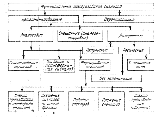 Для того чтобы как-то систематизировать множество аналоговых, цифровых и смешанных функциональных преобразований, выделим в каждом из них три подкласса: генерирование сигналов, усиление и трансформация сигналов, формирование сигналов. Первый и второй подклассы пояснений не требуют. В третий подкласс сведены все преобразования, связанные с изменением формы и Спектрального состава сигналов. Это наиболее обширный подкласс, включающий модуляцию и детектирование сигналов, смешение, фильтрацию, ограничение и т. д. Форма и спектральный состав сигналов связаны между собой известными преобразованиями Фурье [1.38]. Следовательно, можно взять за основу изменение формы сигналов (временной подход) или изменение спектрального состава (спектральный подход). При дальнейшей классификации подкласса формирования сигналов, приведенной на рис. 1.3, выбран спектральный подход. Используя теоремы о спектрах, можно выделить в этом подклассе, по крайней мере, шесть видов математических преобразований, указанных в табл. 1.2.