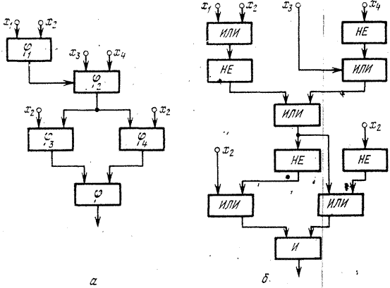 Практически наиболее часто используют ЛЭФП сложения (ИЛИ), умножения (И) и отрицания (НЕ). ЛЭФП достаточно хорошо рассмотрены в работах [1.35-1.41] и др. Основной задачей функционального синтеза ИС является построение ее мелкомасштабной схемы, обладающей высокой степенью однородности. Под мелкомасштабной функциональной схемой (моделью) ИС будем понимать документ, определяющий число ЭФП, комплекс которых полностью отражает характер и последовательность происходящих в ИС функциональных преобразований сигналов, их типы и взаимосвязь между ними. Процесс синтеза функциональной схемы, в основном; сводится к ее последовательной детализации с помощью разукрупнения функциональных элементов вплоть до ЭФП. Первый этап указанного синтеза, предусматривающий разделение общего алгоритма функционирования ИС на ряд частных и менее сложных алгоритмов, осуществляется посредством специальной отработки технического задания. Частные алгоритмы решения основных и вспомогательных задач взбираются по степени их важности. Первая, основная задача реализуется в виде определенного участка синтезируемой схемы, она становится как бы центром (ядром) ее «кристаллизации». Этот участок последовательно наращивается по мере реализации основных, а затем и вспомогательных задач алгоритма. Полученная таким образом схема может быть относительно крупномасштабной. Поэтому ее детализируют последовательным понижением уровня сложности функциональных элементов, т. е. с помощью «расщепления» их на простые. В результате общее число элементов интегральной микросхемы увеличивается. При синтезе относительно несложных функциональных схем последние непосредственно составляются из ЭФП. При синтезе логических схем со множеством входов и одним выходом придерживаются следующих правил: а) выбирается так называемый базис или система ЛЭФП (чаще всего схемы И, ИЛИ, НЕ), из которых будет синтезироваться интегральная схема; б) алгоритм работы схемы описывается известными законами математической логики через соотношения, определяемые выбранными ЛЭФП; в) общее выражение алгоритма разбивают на ряд менее сложных взаимосвязанных между собой частных функций; г) на основе выбранной системы частных функций строят логическую схему. Для иллюстрации рассмотрим два примера. Пример 1.1. Синтезировать логическую функциональную схему автоматического устройства. Входы. Схема имеет четыре входа, на которые подаются потенциальные сигналы (логические «нуль» и «единица»). Выходы. Схема имеет один сигнальный выход. Алгоритм работы схемы имеет вид