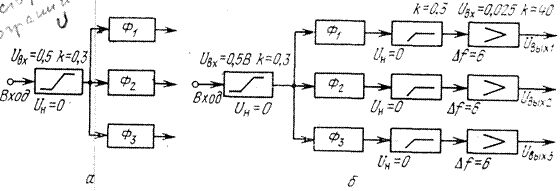Рис. 1.5. Реализация первой основной задачи (а) и полная аналоговая функциональная схема распределителя сигналов (б): Для