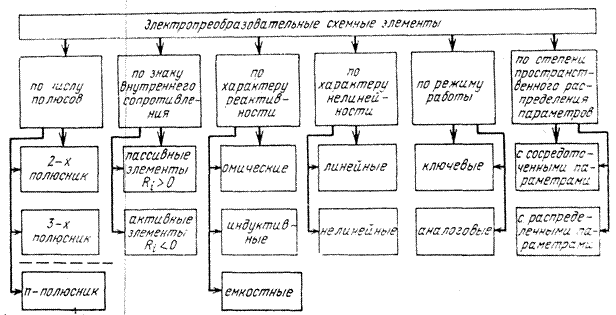 Основным методом этого моделирования является метод граничных испытаний схемы [1.22, 1.45]. Классификация типов электрических моделей приведена на рис. 1.6. В заключение остановимся на классификации используемых на практике элементов принципиальных электрических схем, приведенной на рис. 1.7. Эти элементы прежде всего характеризуются числом полюсов (входов и выходов электрического тока). Существуют двухполюсные (резисторы, конденсаторы, диоды), трехполюсные (транзисторы, RC -структуры), четырёхполюсные (трансформаторы, тиристоры) и в общем случае n-полюсные элементы. С ростом числа полюсов конструктивная сложность элемента и его возможности преобразования сигнала, как правило, существенно возрастают; одновременно увеличивается гибкость управления режимом работы. Элементы делятся на пассивные и активные. Пассивные элементы, обладающие положительным сопротивлением (
