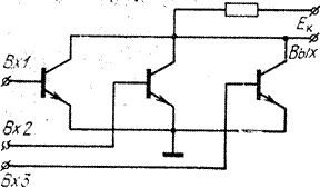 ИС с перестраиваемой структурой. Разработка каждой новой ИС сопряжена со значительными затратами. В силу известных трудностей унификации аналоговых и импульсных ИС все же велико. Поэтому в настоящее время разрабатываются схемы с перестраиваемой структурой. Перестройку можно осуществлять двумя методами: с помощью формирования недостающих соединений печатного монтажа ИС и с помощью электрического управления. Сущность первого метода проиллюстрируем на примере логических монолитных ИС марки ХС-157, выпускаемой фирмой «Моторола» [1.55]. В кремниевой подложке сформированы 12 одинаковых ДТЛ, принципиальная схема которых приведена на рис. 1.17. ДТЛ-схема выполняет операцию НЕ-ИЛИ. В каждой ДТЛ-схеме отсутствуют соединения диодов с выходными нагрузочными резисторами. Все 12 схем электрически изолированы друг от друга. Все межэлементные соединения, указанные на рис. 1.17, выполняются фирмой-изготовителем ИС. Они формируются в виде однослойного печатного монтажа. Сверху наносится изоляционная маска из стекла или SiO2 таким образом, чтобы через ее «окна» были открыты контактные площадки ДТЛ-схем. Второй слой межэлементных соединений проектирует и наносит фирма-потребитель ИС.