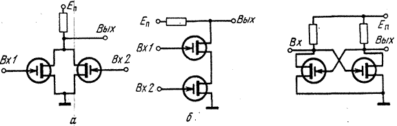 Рис. 1.13. Рис. 1.14. Рис. 1.13. Двухвходовая схема совпадения НЕ — И с параллельным (а) и последовательным соединением МДП-транзисторов (б). Рис. 1.14. Схема триггера с непосредственными связями на МДП-транзистора.х.