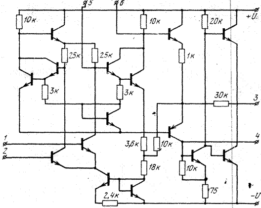Рис 1.15. Электрическая принципиальная схема операционного усилителя в интегральном исполнении: