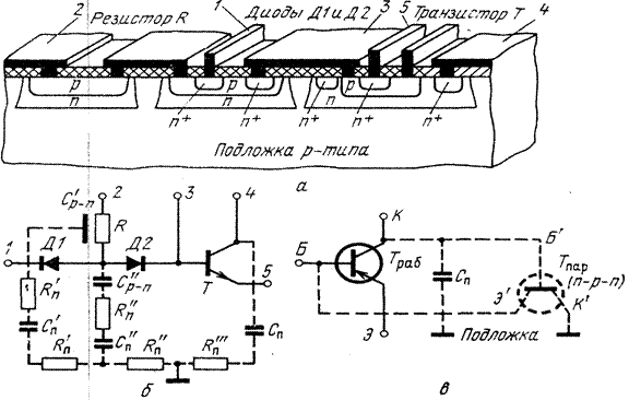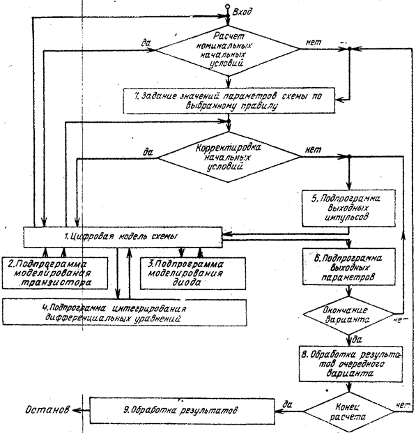 Рис. 1.19.Участок полупроводниковой ИС (а), его упрощённая эквивалентная электрическая схема (б), условная эквивалентная схема интегрального транзистора с изолирующим p—n-переходом (в). Планарный транзистор полупроводниковой ИС часто электрически изолируется от других элементов p—n-переходом (см. рис. 1.19, а). В итоге транзисторная структура получается четырехслойной с тремя p—n-переходами. Эквивалентная схема такой структуры отражает два транзистора: рабочий и «паразитный». Паразитный транзистор в одних случаях улучшаёт импульсные параметры рабочего транзистора, уменьшая накопленный заряд, а в других случаях (в схемах с непосредственными связями) ухудшает их, увеличивая сдвиг входных характеристик при насыщении. Естественно, что указанные ограничения уменьшают гибкость эксперимента. В качестве иллюстрации к сказанному на рис. 1.19, б, в приведены принципиальная схема участка полупроводниковой ИС и его упрощенная эквивалентная схема. В схеме транзистор Tраб, резистор R и два диода Д1 и Д2 являются основными или рабочими элементами, а транзистор Тпар — паразитным. Емкости Сп, С’п и С”п п между подложкой и n-слоем транзисторной, резисторной и диодных структур, а также ёмкости С'p—n и С”p—n между n- и p-слоями резисторной и диодных структур, сопротивления R'п и R”п n-слоев и сопротивления R'п, R”п и R”’п подложки являются паразитными элементами. Ёмкость С'p—n имеет распределённый характер. Математическое моделирование. Теоретический анализ или моделирование схем обычно производится с помощью ЭВМ. Анализ состоит из следующих последовательных этапов: формализация схемы, составление ее математической модели, разработка алгоритма и программы моделирования, процесс моделирования работы схемы на вычислительной машине, исследование полученных данных. При формализации реальную схему заменяют ее более упрощенным эквивалентом, отражающим главные исследуемые свойства реальной схемы. Математическая модель схемы, как правило, отражает систему дифференциальных уравнений, описывающих протекающие в схеме электрические процессы, а также ограничения, выраженные в виде равенств, неравенств, числовых коэффициентов и т. п. Алгоритм составляется независимо от конкретного типа вычислительной машины. Программа моделирования работы схемы обычно содержит ряд типовых подпрограмм, отражающих моделирование отдельных сложных элементов (транзисторов и др.). К программе предъявляются требования универсальности, возможности применения для моделирования широкого класса схем, удобства вмешательства на разных этапах моделирования и компактности выдачи конечных результатов. Составление больших программ является сложным и трудоемким процессом. В настоящее время разработаны стандартные программы моделирования электронных схем на ЭВМ. Примерами таких программ могут служить ПАЭС (программа анализа электронных схем) [1.57] и «Фрехта» (программа расчета и анализа частотных характеристик линейных аналоговых схем) [1.58]. В программе ПАЭС предусматривается расчет переходных процессов схемы, статистический анализ статических и динамических характеристик схемы и расчет схемы на предельный случай. В ее состав входит внешняя программа-диспетчер, цифровая модель схемы и комплекс подпрограмм цифрового моделирования. Общая структура ПАЭС представлена на р
