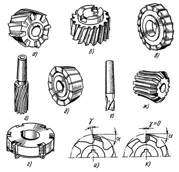 В зависимости от назначения и вида обрабатываемых поверхностей различают следующие типы фрез: цилиндрические (рис. 2.4.2, а), торцовые (рис. 2.4.2, б, з), дисковые (рис. 2.4.2, б), концевые (рис. 2.4.2, г), угловые (рис. 2.4.2, д), шпоночные (рис. 2.4.2, е), фасонные (рис. 2.4.2, ж).