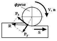 Рис. 2.4.5. Силы резания при работе цилиндрической прямозубой фрезой Pz определяется по формуле: