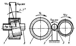 Перед шлифованием ведущий круг устанавливают наклонно под углом 1 – 7 0 к оси вращения заготовки. Вектор скорости этого круга разлагается на составляющие и возникает продольная подача Sпр. Поэтому заготовка перемещается по ножу вдоль своей оси и может быть прошлифована на всю длину. Чем больше угол наклона ведущего круга, тем больше подача Sпр. Процесс легко автоматизировать, установив наклонный лоток, по которому заготовки будут сползать на нож, проходить процесс шлифования и падать в тару.