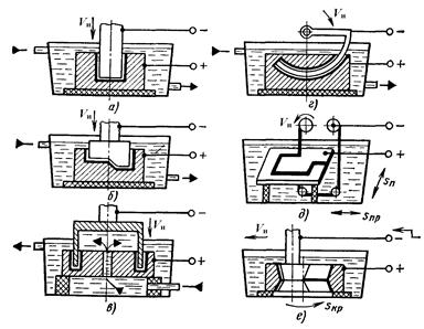 Рис. 4.2.2. Схемы ряда основных операций ЭЭО: а – прошивание отверстия; б – обработка фасонной полости штампа; в – прошивание отверстия по способу трепанации; г – прошивание отверстия с криволинейной осью; д – вырезание заготовки из листа; е – шлифование внутренней поверхности фильеры Методом ЭЭО (рис. 4.2.2) получают сквозные отверстия любой формы поперечного сечения (а), глухие отверстия и полости (б), фасонные отверстия и полости по способу трепанации (в), отверстия с криволинейными осями (г); вырезают заготовки из листа при использовании проволочного или ленточного инструмента-электрода (д), выполняют плоское, круглое и внутреннее (е) шлифование, разрезают заготовки, клеймят детали. ЭЭО применяют для изготовления штампов, пресс-форм, фильер, режущего инструмента, деталей топливной аппаратуры двигателей внутреннего сгорания, сеток и сит. Методом ЭЭО обрабатывают практически все токопроводящие материалы, но эффект эрозии при одних и тех же параметрах электрических импульсов различен. Он определяется временем нагрева поверхности заготовки до температуры плавления. Зависимость интенсивности эрозии от свойств металлов называют электроэрозионной обрабатываемостью. Если принять электроэрозионную обрабатываемость стали за единицу, то для других металлов ее можно представить в следующих относительных единицах: твердые сплавы – 0,5; титан – 0,6; никель – 0,8; медь – 1,1; латунь – 1,6; алюминий – 4; магний – 6. Электроискровым методом целесообразно обрабатывать твердые сплавы, труднообрабатываемые металлы и сплавы, тантал, молибден и другие материалы. Факторы, вызывающие эрозию металла при ЭЭО: 1) тепловое воздействие разрядов; 2) электростатические и электродинамические силы; 3) газообразование в результате распада жидкой рабочей среды; 4) кавитационный удар жидкости.