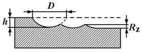В результате единичного искрового разряда на обрабатываемой поверхности образуется углубление диаметром D и глубиной h (рис. 4.2.3). Размеры углубления пропорциональны энергии импульса W: D=k1W(1/3); h= k2W(1/3); где k1, k2 - коэффициенты, зависящие от материала электродов и состава межэлектродной среды. При воздействии на металл серии импульсов, обрабатываемая поверхность формируется в результате перекрытия отдельных лунок. Высота микронеровностей Rz будет равна Rz=(1/3)h=(k2/3)W(1/3). Отсюда можно выразить соотношение энергии импульса W и показателя шероховатости обработанной поверхности Rz: W=(27/k23)Rz3. Обработанная поверхность представляет собой поверхность, образованную перекрытием множества лунок глубиной h и диаметром D (см. рис. 4.2.3). Исходя из требуемой шероховатости поверхности детали после обработки, могут быть выбраны показатели процесса ЭЭО, прежде всего мощность импульсов W.