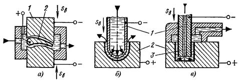 На рис. 4.3.1 показаны схемы обработки заготовок в струе проточного электролита: турбинной лопатки (а), штампа (б) и схема прошивания сквозного цилиндрического отверстия (в).