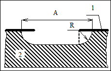 Рис. 4.4.3. Травление металла заготовки под покрытием: 1 – покрытие; 2 – заготовка Под покрытием металл травится по радиусу R. При недостаточной ширине паза (менее 2 мм) в пространстве под покрытием скапливается газ, препятствующий травлению. Для его удаления деталь необходимо периодически встряхивать, переворачивать, прикладывать вибрации. После травления шероховатость обработанных поверхностей увеличивается на 1 – 2 класса (причем больше всего у литых заготовок). Глубина травления обычно составляет 6 – 8 мм (реже до 12 мм). Чем больше глубина травления, тем меньше точность, и больше шероховатость поверхности. Химическим травлением получают местные утонения на нежестких заготовках, ребра жесткости, извилистые канавки и щели, «вафельные» поверхности, обрабатывают поверхности, труднодоступные для режущего инструмента.