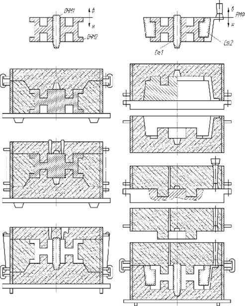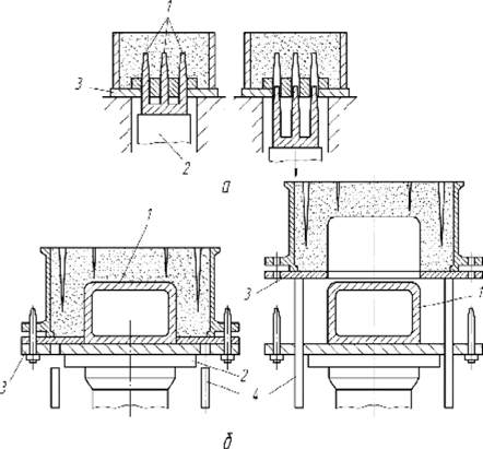 Рис. 17. Схемы изготовления формы для получения отливки крышки подшипника вручную (а) и на машинах (б)