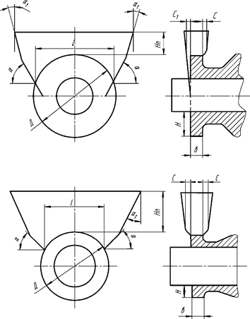 Рис. 175. Эскизы прибылей на ободе зубчатых колес: а – диск, выполненный под углом; б – однодисковое колесо; в – двухдисковое колесо; г – трехдисковое колесо
