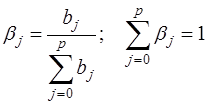 (условие нормировки имеет место, только если все bj имеют одинаковые знаки). Значения βj являются весами для соответствующих коэффициентов bj. Каждый из них измеряет долю общего изменения у, приходящегося на момент (t+j). Средний лаг определяется по формуле средней арифметической взвешенной:
