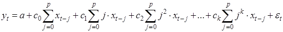 Лаги Алмон. Предполагается, что в модели (15) с конечной максимальной величиной лага р значения коэффициентов bj описываются полиномом к – й степени: