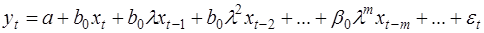 Здесь обычный МНК применить нельзя. Для идентификации модели (26) предполагается, что параметры с увеличением лага убывают в геометрической прогрессии, т.е. с постоянным темпом