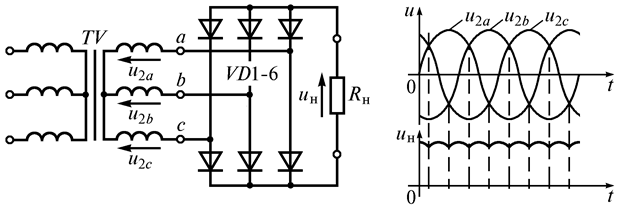 В трехфазных цепях переменного тока промышленной частоты (50 Гц) в основном используют две схемы выпрямителей: трехфазный выпрямитель с нейтральной точкой и трехфазный мостовой выпрямитель. Трехфазные выпрямители используют как выпрямители средней и большой мощности (средние значения выпрямленного тока достигают сотни ампер). В состав трехфазного выпрямителя с нейтральной точкой (рис. 17.5 а) входят трехфазный трансформатор с соединением обмоток звездой, три диода, включенные в каждую фазу вторичной обмотки трансформатора, и нагрузочный резистор. Диоды выпрямителя работают поочередно, каждый в течение трети периода. Ток нагрузки равен сумме токов каждого диода и имеет всегда одно и то же направление. Как видно из временной диаграммы (рис. 17.5 б), пульсации выпрямленного напряжения значительно ниже, чем у однофазных вы–