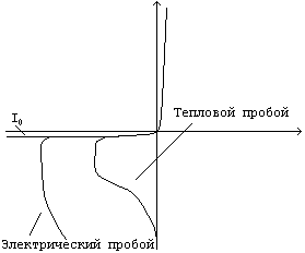 Согласно ВАХ, Iобр=I0 остается постоянным, не зависящим от обратного напряжения, однако при достаточно большом Uобр наблюдается резкое возрастание Iобр – это называется пробоем p-n-перехода, а напряжение, при котором это происходит, напряжением пробоя. Пробои делятся на: 1) Тепловой. 2) Электрический, который в свою очередь делится на туннельный и лавинный (без перегрева).