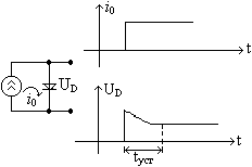 Основные параметры импульсных диодов аналогичны параметрам выпрямительных диодов, кроме того, имеют специфические, учитывающие быстродействие переключения. 1. Ёмкость диода (1пФ) 2. Время установления прямого напряжения на диоде (прямого сопротивления). Определяется скоростью диффузии инжектированных в базу неосновных носителей заряда, в результате чего изменяется сопротивление базы. Первоначально оно высоко, т.к. мала концентрация носителей заряда. После подачи прямого напряжения концентрация неосновных носителей заряда в базе увеличивается, это снижает прямое сопротивление диода. Обнаружить время установления диода можно из следующего эксперимента. 3.Время восстановления обратного сопротивления диода. Определяется как время, в течение которого обратный ток диода после переключения полярности приложенного напряжения достигает своего станцеонарного значения.