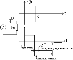 Предназначены для работы с импульсными сигналами (быстро изменяющимися во времени). Диоды в таких схемах выполняют роль электрических ключей. Электрический ключ имеет два состояния: 1. Замкнутое. Rvd =0 2. Разомкнутое. Rvd= ∞ Таким же требованиям удовлетворяют и диоды в зависимости от полярности приложенного напряжения. 3. Быстродействие ключа. В импульсных диодах высокая скорость переключения достигается уменьшением площади p-n-перехода, что снижает величину ёмкости диода. Факторами, ограничивающими скорость переключения диода является: а) ёмкость. б) скорость диффузии. в) время рассасывания неосновных носителей заряда.