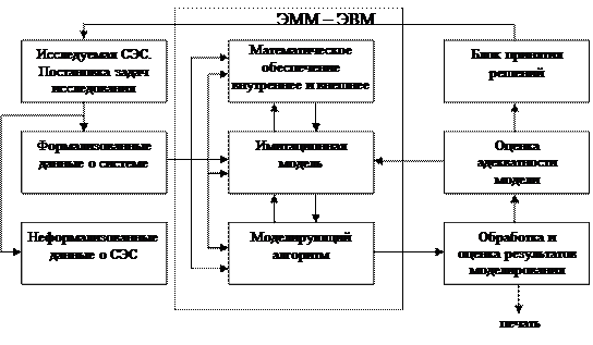 Имитационное моделирование систем и процессов. Применяется в случаях, когда нельзя заформализовать модель (описать аналитическим выражением) и в случае, когда система представляет собой многопараметрическую вероятностную экономическую систему. Кроме того, моделирование с помощью имитационных подходов применяется для систем больших размерностей и с большими внутренними связями. Основные этапы моделирования: 1) анализ моделируемой систем, сбор необходимой информации, выделение проблемной области исследования и постановка задач на исследование; 2) синтезирование (формирование, получение) необходимой математической модели области допустимых упрощений (ограничений), выбор критериев оценки эффективности и точности моделирования; 3) разработка имитационной модели, алгоритма ее реализации, внутреннее и внешнее математическое обеспечение; 4) оценка адекватности имитационной модели и контроль результатов экстремумов с последующей валидацией модели; 5) анализ результатов моделирования с целью достижения заданной точности моделирования.