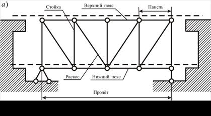 Рис. 27 В зависимости от назначения различают фермы стропильные, крановые, башенные, мостовые и т.д. Мостовые фермы в зависимости от уровня езды делятся на фермы с ездой понизу (Рис. 25, б) ездой поверху и понизу(Рис. 25, а) и ездой посредине (Рис. 28). Линия езды обозначается пунктирной линией.