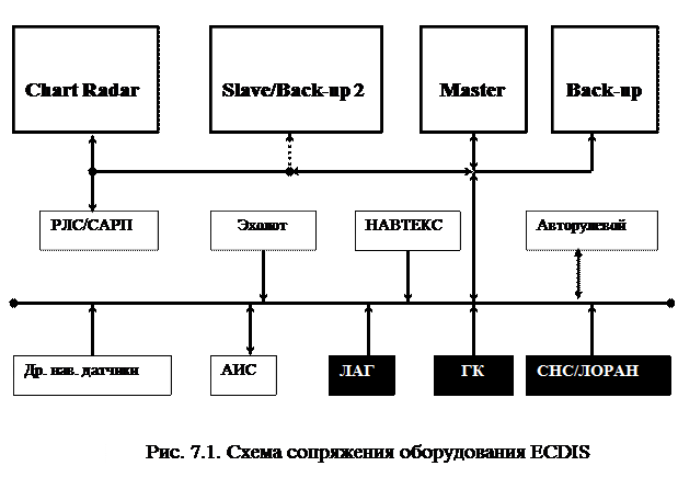 7.1. Схема сопряжения ECDIS – оборудования. Всё навигационное оборудование картографической системы, как отмечалось ранее, работает в единой сети. На рис 6.1 приведены компоненты основного комплекта ECDIS (Master). Использование в качестве резервного комплекта (Back-up) коллекции бумажных карт теряет смысл закупки такого оборудования, так как судовладелец вынужден производить затраты как на закупку современного оборудования с электронными картами, так и на закупку и поддержку бумажной коллекции. В этом случае необходим резервный комплект оборудования, представляющий отдельный компьютер морского исполнения. Рассматривая ECDIS как единый программно-аппаратный комплекс сетевого исполнения необходимо выделить основные и дополнительные навигационные датчики, обеспечивающие контроль безопасности судовождения и наблюдения за окружающей обстановкой. На рис. 7.1 приведена схема работы основного комплекта (Master), резервного (Back-up) и дополнительных судовых станций (Slave/Back-up 2), которые могут находиться в сети и быть подключены «вручную» для выполнения функций основного и (или) резервного комплекта. Master и Back-up имеют постоянную интерактивную связь, автоматически информируя судоводителя о возможных несоответствиях показаний навигационных или отказов работы оборудования. В случае выхода из строя Master, Back-up в автоматическом режиме становится Master. Оборудование Slave/Back-up 2 не предусмотрено в обязательном режиме функционировании ECDIS, но может быть также использоваться на судне. В случае выхода из строя Master или Back-up это оборудование может выполнять их функции. Особенно актуальным становится использование картографического радара (Chart Radar) в комплексе ECDIS. Элементы электронных карт могут выводиться на экран радара в соответствии с требованиями Международного стандарта IEC 60936 Ed.1, 2002. Такие радары приобретают всё большую востребованность на флоте и являются перспективными. Как отмечалось ранее, IMO рекомендует использовать наложение радиолокационной картинки (Overlay) на электронную карту (IMO SN.1/Circ.255, 2006). Это позволит обнаружить возможные ошибки в системе позиционирования, особенно в случае неизвестного эллипсоида, на основе которого построена электронная карта. Далее анализируется пример выявления подобных несоответствий. На рис. 7.1 представлена схема сопряжения навигационных датчиков судовой сети, где выделены обязательные навигационные датчики, информация которых должна отображаться в оборудовании ECDIS. Выделенной линией указан путь доставки этой информации в основной, резервный и дополнительный комплекты оборудования.