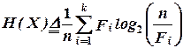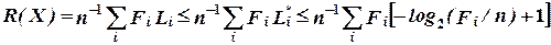 Напомним, что сформулированная ранее теорема Шеннона для канала без помех определяет верхнюю границу степени сжатия для любых кодов через энтропию вектора X. Найдем верхнюю и нижнюю границы степени сжатия для кода Хаффмена. Пусть R(X) - скорость сжатия, определяемая как отношение R = k/n, (2.7) измеряемая в битах (числе двоичных символов) на букву и получаемая при кодировании вектора данных X с использованием кода Хаффмена. Необходимо найти границы для R(X), выраженные через энтропию вектора X. Пусть X - вектор данных длиной n и (F1, F2,..., Fk) - вектор частот символов в X. Энтропия H(X) определяется как
