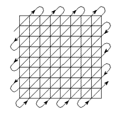 Совершенно очевидно, что от выбора таблицы квантования будет в значительной степени зависеть как эффективность сжатия – число нулей в квантованном (округленном) спектре,– так и качество восстановленной картинки. Таким образом, мы округлили результат DCT и получили в большей или меньшей степени искаженный поблочный спектр изображения. Следующим этапом работы алгоритма JPEG является преобразование 8х8 матрицы DCT -спектра в линейную последовательность. Но делается это таким образом, чтобы сгруппировать по возможности вместе все большие значения и все нулевые значения спектра. Совершенно очевидно, что для этого нужно прочесть элементы матрицы коэффициентов DCT в порядке, изображенном на рис. 2.10, то есть зигзагообразно - из левого верхнего угла к правому нижнему. Эта процедура называется зигзаг-сканированием.