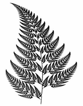 Рис. 2.12 Расставляя линзы и меняя их характеристики, можно управлять получаемым изображением. Одна итерация работы машины заключается в том, что по исходному изображению с помощью проектирования строится новое, после чего новое берется в качестве исходного. Утверждается, что в процессе итераций мы получим изображение, которое перестанет изменяться. Оно будет зависеть только от расположения и характеристик линз и не будет зависеть от исходной картинки. Это изображение называется “ неподвижной точкой ”, или аттрактором данной IFS. Соответствующая теория гарантирует наличие ровно одной неподвижной точки для каждой IFS. Поскольку отображение линз является сжимающим, каждая линза в явном виде задает самоподобные области в нашем изображении. Благодаря самоподобию получаем сложную структуру изображения при любом увеличении. Таким образом, интуитивно понятно, что система итерируемых функций задает фрактал — самоподобный математический объект. Наиболее известным из изображений, полученных с помощью IFS, является так называемый “папоротник Барнсли” (рис. 2.13), задаваемый четырьмя аффинными преобразованиями (или, в нашей терминологии, “линзами”). Каждое преобразование кодируется буквально считанными байтами, в то время как изображение, построенное с их помощью, может занимать и несколько мегабайт.