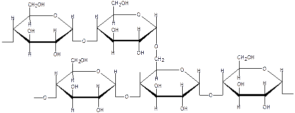 Макромолекулы амилопектина сильно разветвлены, они содержат от 600 -6000 остатков а - D -глюкопиранозы, которые соединены между собой а -1,4- гликозидными связями в длинную цепь, от которой отходят ветвления более коротких цепочек, прикрепленных гликозидными связями а -1,6 (образуется нередуцирующий конец). Частично веточки также сворачиваются в спираль. Молекулярная масса амилопектина от 103 до 106.Соотношение амилозы и амилопектина в разных видах крахмала различны. В среднем крахмал содержит 25% амилозы и 75% амилопектина. В восковидной кукурузе содержание амилопектина выше 95%.