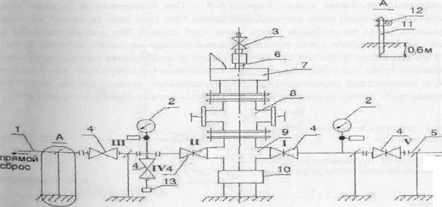 Задвижка № 5 в нормальном состоянии – открыта; Задвижки № 1, 2, 3, 4 – закрыты; Обозначения ксхеме 3. 1. К насосным установкам или прямой сброс; 2. Манометр с запорным устройством и разделителем сред; 3. Кран высокого давления (КВД); 4. Задвижка; 5.Выкидная линия (в емкость долива, желобную систему); 6. Насосно-компрессорные трубы (НКТ); 7. Гидроротор (КМУ, АПР); 8. Превентор; 9.Крестовина арматуры или переходная катушка для АУШГН, АУЭЦН; 10. Муфта обсадной трубы; 11. Опора; 12. Хомут крепления выкидной линии; 13. БРС.
