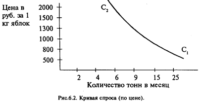 Шкала спроса показывает, сколько товаров можно купить по различным ценам за данный период. Анализ этой шкалы позволяет легче выявить взаимозависимость цены и спроса. Закон спроса выражает следующую функциональную (математическую) зависимость спроса (С) от цены (Ц): С = F (Ц), где F - показатель количественной зависимости. Чем выше цена товара, тем меньше спрос на него со стороны покупателей. Например, в нашей стране повышение цен на подписные издания в 1991-1995 гг. привело к сокращению объема подписки. Действует и обратная зависимость: чем ниже цена, тем больше спрос. Такая количественная зависимость представлена в виде графика (рис.6.2.). Здесь взят тот же условный примере о продаже яблок на местном рынке. На оси ординат отложены цены на яблоки. По оси абсцисс указано количество яблок, на которое предъявлен спрос. Кривая С1 – С2 на графике показывает: при повышении цены платежеспособная потребность людей сокращается и наоборот, когда цена снижается, спрос на продукты увеличивается.