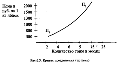 Шкала предложения показывает, сколько товаров продавцы готовы продать по разным ценам. Приводимые цифры раскрывают взаимозависимость цены и предложения. Закон предложения характеризует следующую функциональную зависимость предложения (П) от цены: П=F (Ц). Чем выше цена, тем в большей мере растет предложение продуктов со стороны продавцов. И наоборот: чем ниже цена, тем ниже предложение. Данная взаимосвязь наглядно представлена на графике (рис.6.3.). Ее иллюстрирует опять же пример с продажей яблок. На оси ординат отложены цены на яблоки, а по оси абсцисс - количество яблок, которое продавцы готовы произвести и продать. Кривая П1 – П2 на графике показывает, как с ростом цены производители увеличивают объем продажи, и наоборот, предложение с их стороны уменьшается при снижении цены.