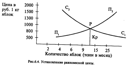Рис.6.4. Установление равновесной цены. Если спроецировать равновесную точку на ось абсцисс, то мы обнаружим равновесное количество (Кр), характеризующее количественное совпадение спроса и предложения. Теория спроса и предложения, базирующаяся на концепции предельной полезности, не смогла раскрыть экономическую природу равновесной цены. Ведь в данной точке воздействие спроса и предложения на цену взаимопогашается, а поэтому не понятно, чему соответствует данный уровень цены. А.Маршалл попытался рассмотреть, например, предложение как сумму цен факторов, затраченных на производство товара. Однако получалось, что назначенная продавцом цена объясняется тоже ценой... А.Маршалл счел нецелесообразным углубляться в выяснение сути спроса и предложения. Он ограничился описанием воздействия на цену рыночных сил. В свое время интересную попытку глубоко раскрыть природу равновесной цены с позиции трудовой теории стоимости предпринял К.Маркс. Он заметил, что предложение и спрос регулируют только временные колебания рыночных цен. По его словам, "в I тот самый момент, когда эти противоположные силы становятся равными, они взаимно парализуют друг друга и перестают действовать в том или другом направлении. В тот момент, когда между предложением и спросом устанавливается равновесие и потому они перестают действовать, рыночная цена товара совпадает с его действительной стоимостью, с нормальной ценой, вокруг которой колеблются его рыночные цены".1